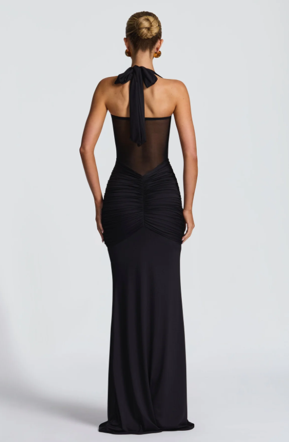 Sukienka Vixen Maxi Dress w kolorze Black to połączenie zmysłowości i nowoczesnej elegancji. Wykonana z elastycznego, dopasowanego dżerseju oraz prześwitującej siateczki, pięknie podkreśla sylwetkę. Dekolt w kształcie serca z subtelnym skrętem oraz wiązanie na szyi nadają jej romantycznego charakteru. Marszczone wstawki na biodrach i delikatne wiązanie z przodu akcentują talię, a spódnica o kroju fit & flare zapewnia lekkość i swobodę ruchu. W pełni podszyty biust i spódnica gwarantują komfort noszenia, bez konieczności stosowania zamka błyskawicznego.